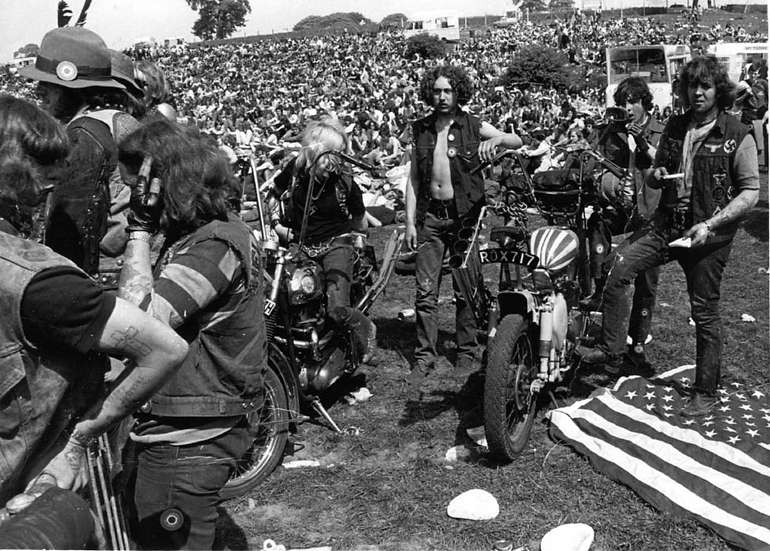 But, you know, not really. These were the British version of the Hells Angels that Mick Jagger had taken a liking to at the Stones’ Hyde Park show, leading to the disaster at Altamont, and they weren’t up to snuff. Look at that drawn-on swastika. That guy in the bear hat from Gimme Shelter could take these sissipated poseurs all by himself.
